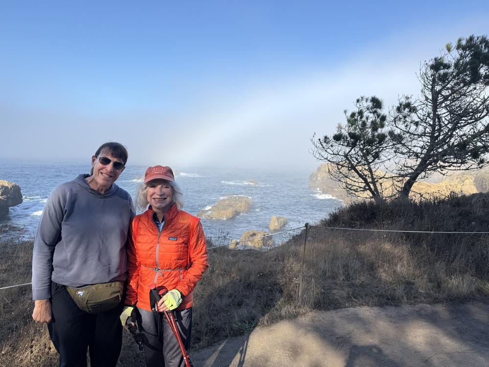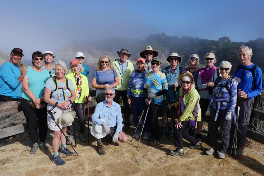 Although 18 hikers woke to blue skies downtown, when we arrived at Point Lobos State Park, it was foggy and even worse, our standard parking lot at Piney Woods was closed for a special event! Since there was no other parking area with enough space left for all of us, we split up and then managed to find one another on the trail. Soon the sun started to break through, and we saw our first “fogbow,” –yes, it’s actually a thing—a rainbow in the fog. Gradually the sky brightened, and we spotted Sea Lion Rocks, which we think were covered with sea lions (we could hear them anyway). We also met a researcher from the Aquarium who was monitoring a sea otter pup that had been abandoned, then paired with a surrogate sea otter mom and released.