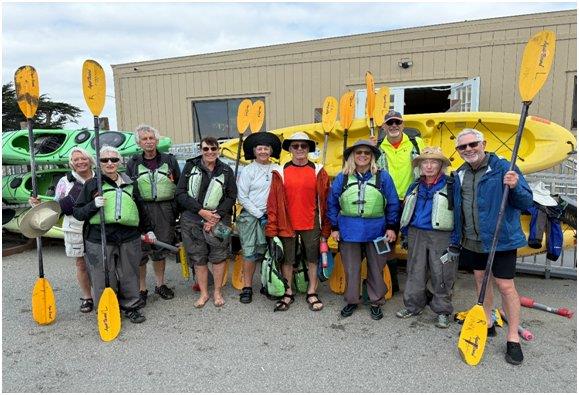 Two groups of bikers did our 28-mile ride to Pebble Beach, meeting at Bird Rock, which was covered with squawking cormorants. On the way, we met a birder who shared his binoculars to spot two beautiful harlequin ducks and wandering tattler, birds not usually seen in this area. 25 of us converged on the Gallery Café, where to our dismay, we had to split a single mass check between us. Newcomer Marty B came to the rescue, offering to cover the check and collect from everyone. After the ride back to town, 8 pickleball players battled strong winds at Via Pariso Park chasing squirrelly yellow whiffle balls. Luckily everyone emerged without injury. In the evening, most of us strolled through the Farmer’s Market, sampling pluots, tahini spread, and kettle corn and then meeting at the Fieldwork Brewing Company patio with our take-out dinners before trudging back to the Day’s Inn—that was a long day!